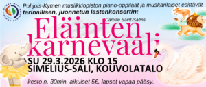 Pohjois-Kymen musiikkiopiston pianistien ja muskarilaisten lastenkonsertissa kuullaan Camille Saint-Saënsin rakastettu teos ElÀinten karnevaali. Muskarilaiset ja musiikkiopiston pianistit esittÀvÀt sÀvellyksen elÀimet lavalla. Konsertin juontaa Johanna Hasu. Yleisö saa touhuta mukana konsertissa!